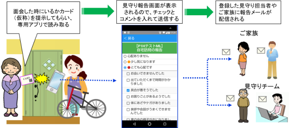 いるかメールは、地域住民が見守り役となった高齢者見守り活動をサポートするシステムです。
